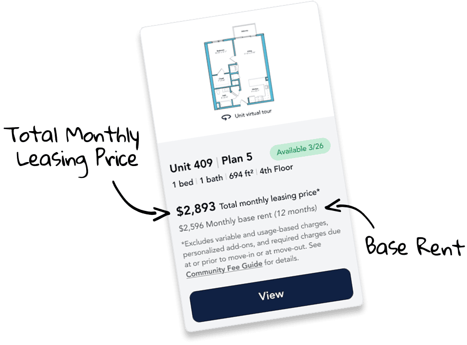 Planning your budget is essential, and we’re here to make it simpler. Our Total Monthly Leasing Price reflects all fixed, mandatory fees alongside your base rent, giving you a complete picture of your monthly costs. To customize your Total Monthly Leasing Price and plan with confidence, use our Calculate My Costs tool found within the Map view. We’ve also provided a list of all potential fees you may encounter as a resident which can be found at the bottom of the page.